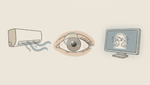 低湿度や低温は、涙の蒸発を亢進させるのでドライアイを悪化させます。冬場になるとドライアイが悪化するのはそのためですが、冬以外でも、エアコンの効き過ぎや送風を直接受けるような環境はよくありません。