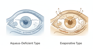 涙そのものが少ないタイプです。涙腺からの涙の分泌が減少することで、目の表面を十分に潤すことができなくなります。加齢やストレス、自己免疫疾患などが原因となることが多く、特にシェーグレン症候群という自己免疫疾患では、涙腺や唾液腺の組織に対する免疫反応が生じ、強いドライアイや口腔乾燥症状をきたします。